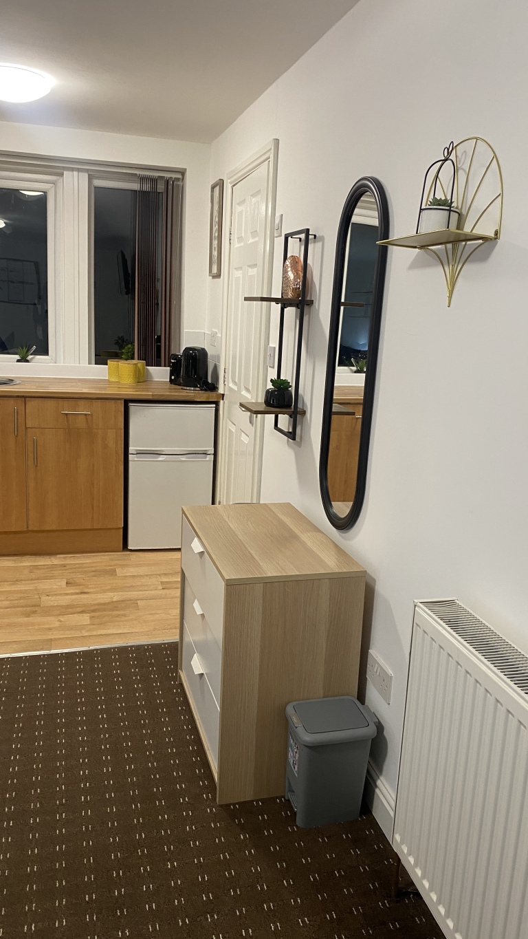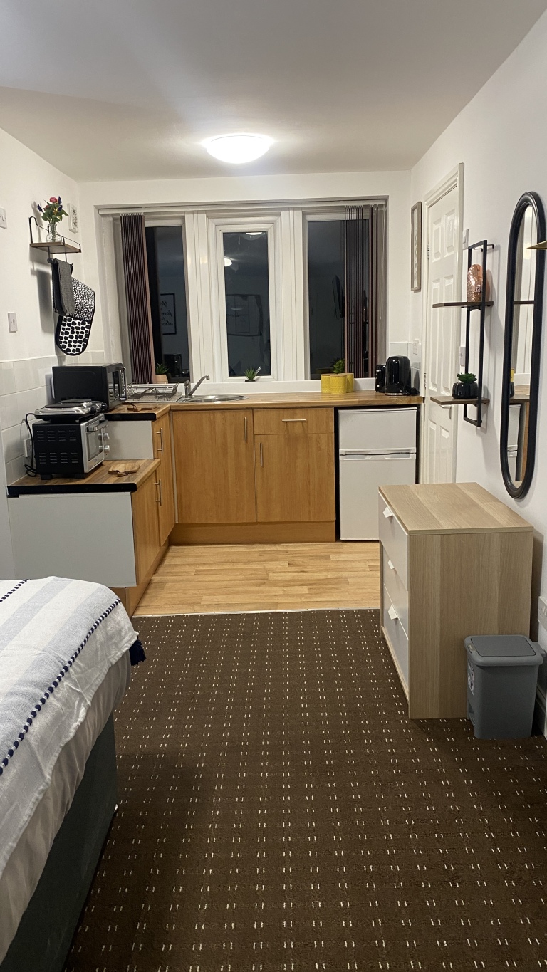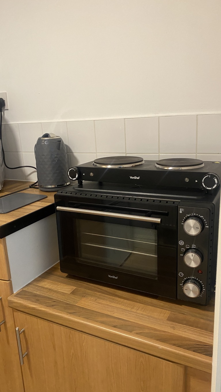 The kitchen is fully equipped for all your cooking needs with appliances and utensils. There is a 2 Plate Mini Hot Plate Hob with a Mini Oven in the room.