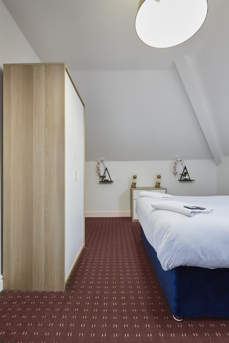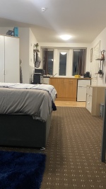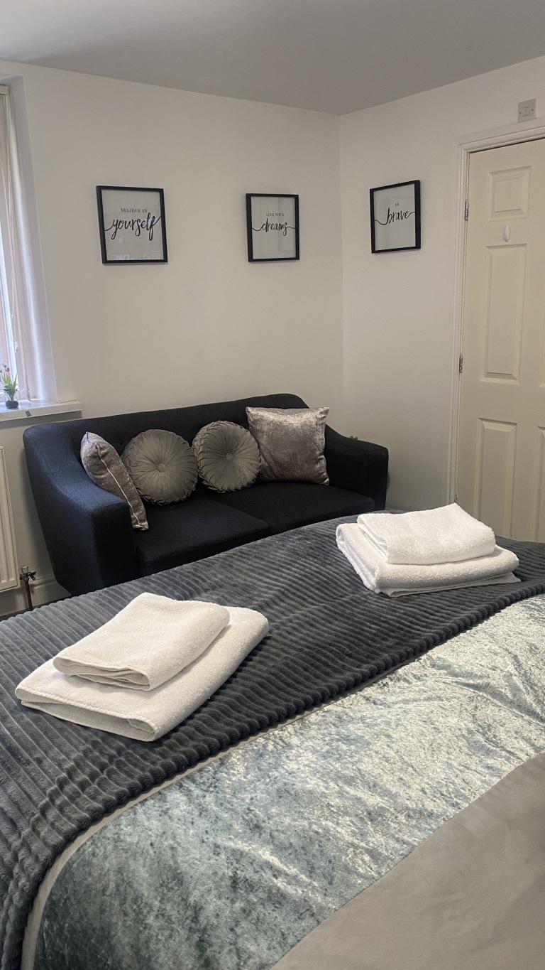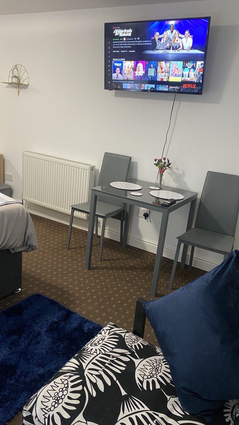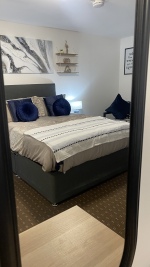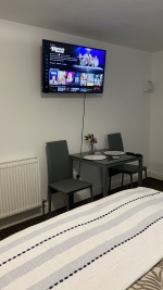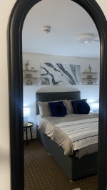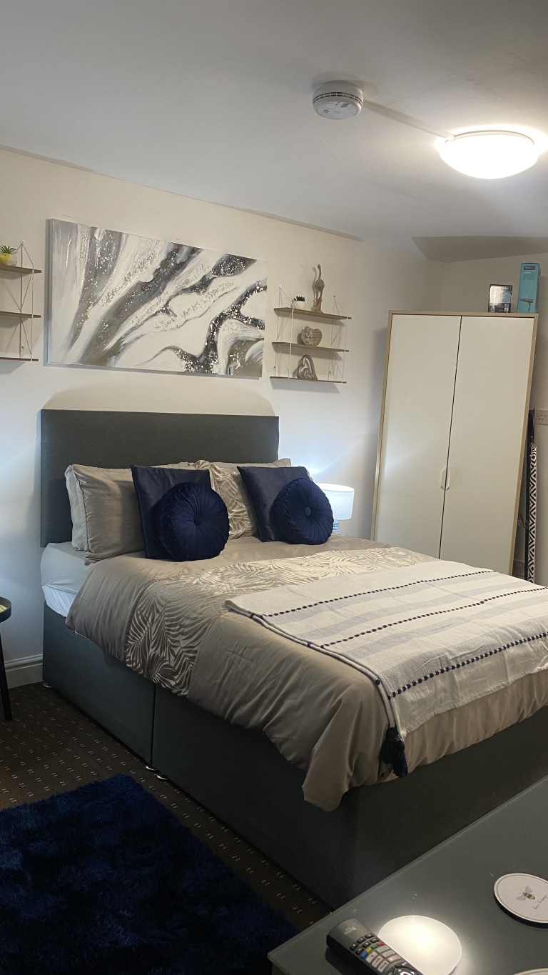 his stylish clean 1-bed/1-bath Ensuite Room, conveniently located 1.8 mile less than 7 mins away from the town center, and able to sleep 2 guests comfortable. There is a double bed and mattress with a small table and chair.