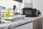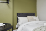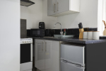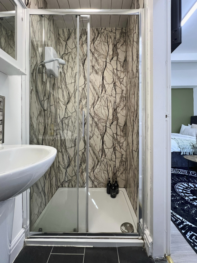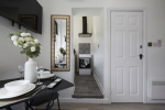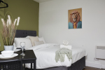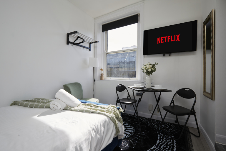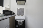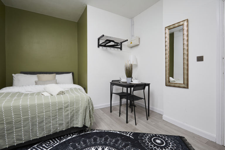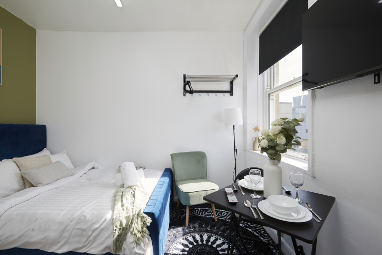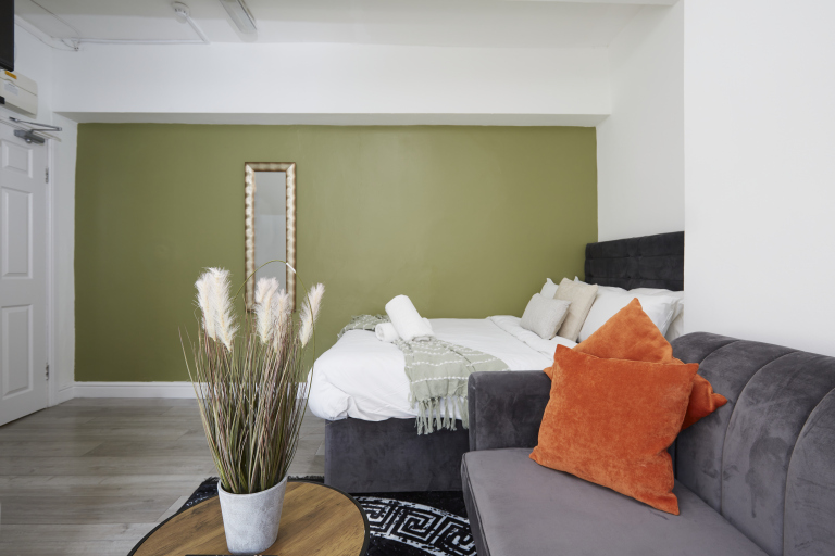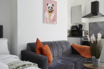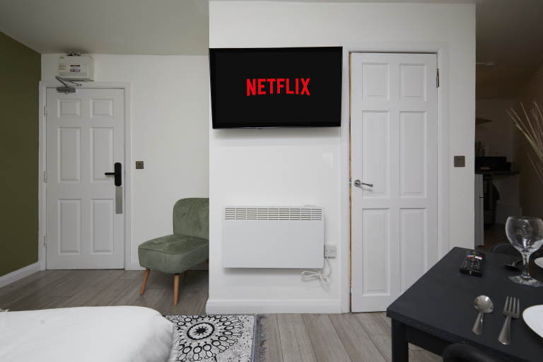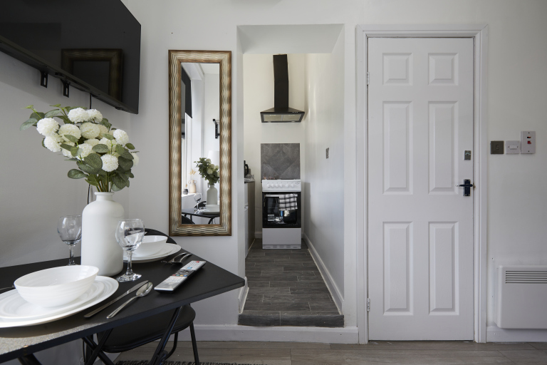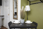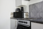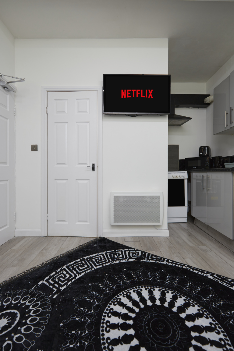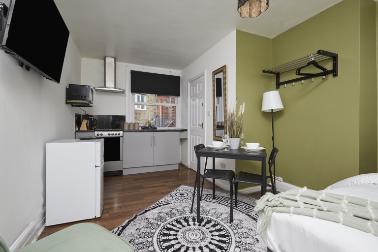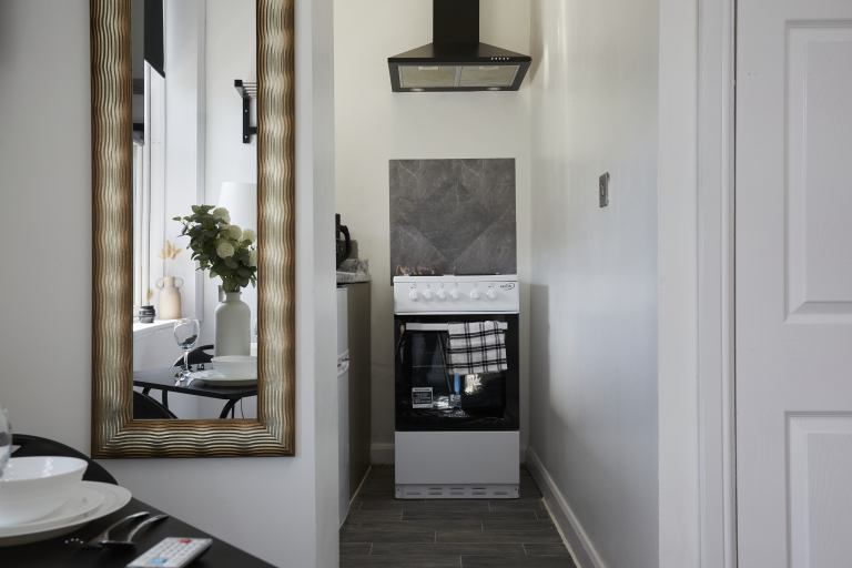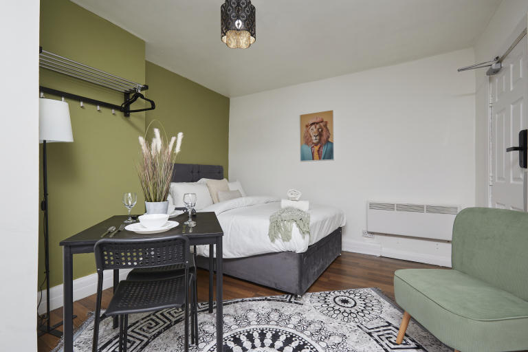 This stylish 1-bed/1-bath studio apartment is clean, conveniently located in town centre, and able to sleep 2 guests comfortable. There is a double bed and mattress, along with a sofa. The kitchen is fully equipped for all your cooking needs with appliances and utensils. The bathroom includes and dispenser with soap, shampoo, and conditioner. Complimentary amenities include wi-fi, heating, and a 43” Smart TV with amazon stick loaded with plenty of movie apps. Free coffee, and tea, are included.